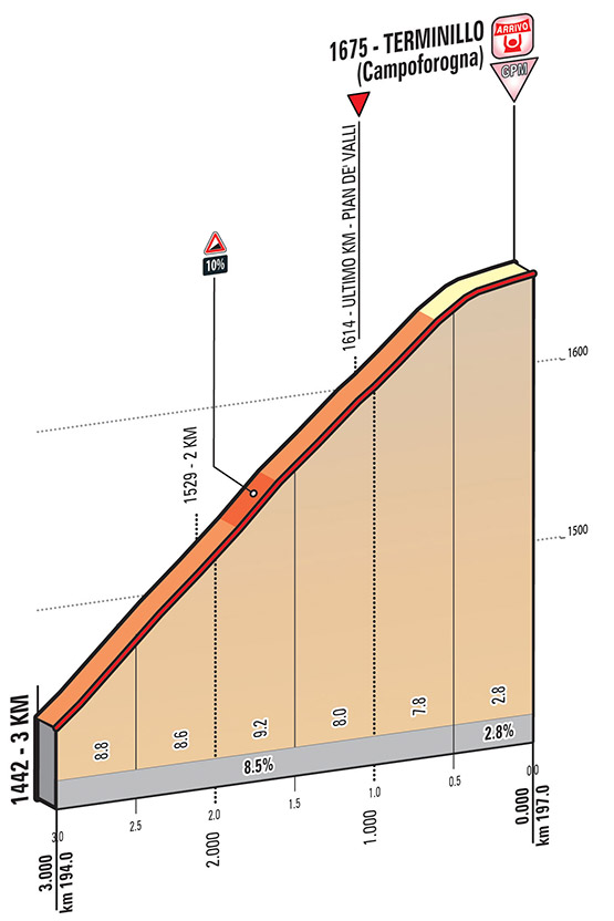 La fuga no tiene opciones. Sky y Tinkoff controlarán y en Terminillo, o un poco antes, enfilarán el pelotón. De a poco irán seleccionando, pero el fuerte viento frontal impedirá los ataques lejanos. Lo más lógico sería que llegue un grupo reducido al cierre, donde estarían Pozzovivo, Pinot, Quintana, G. Caruso, Purito, Nieve, Kreuziger y Contador.
