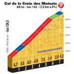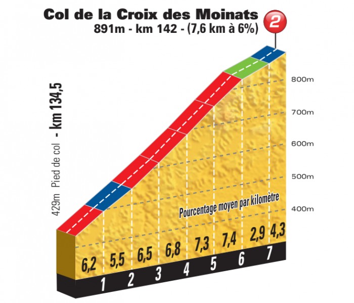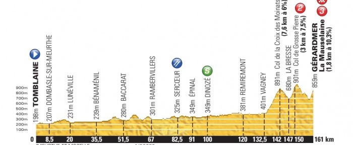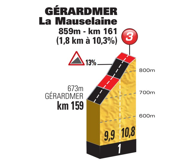 En la toma de contacto con la montaña, el pelotón deberá superar tres escollos durante la jornada: el primero será en el Km 142, el Col de la Croix des Moinats de 2° categoría (7.6 km al 6%). Tras un descenso de 5 kilómetros volverán a pararse en los pedales para dar paso a Col de Grosse Pierre (3 km al 7.5%), un puerto de 2° categoría que se corona a 11 kilómetros de la meta que dará paso a la última cota donde estará la línea de sentencia, la Côte de La Mauselaine (3° categoría-1.8km al 10.3%), que decidirá al ganador de la etapa.