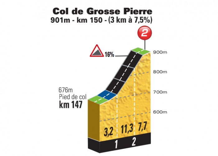 En la toma de contacto con la montaña, el pelotón deberá superar tres escollos durante la jornada: el primero será en el Km 142, el Col de la Croix des Moinats de 2° categoría (7.6 km al 6%). Tras un descenso de 5 kilómetros volverán a pararse en los pedales para dar paso a Col de Grosse Pierre (3 km al 7.5%), un puerto de 2° categoría que se corona a 11 kilómetros de la meta que dará paso a la última cota donde estará la línea de sentencia, la Côte de La Mauselaine (3° categoría-1.8km al 10.3%), que decidirá al ganador de la etapa.