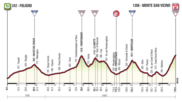 La quinta etapa será crucial para la general, con la subida a Monte San Vicino. Son 10km al 7.8%, con secciones del 12%. Por las fechas en las que estamos, hará mucho frío en los Apenninos.