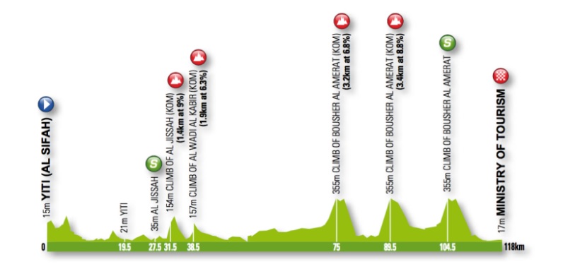 La segunda jornada verá el comienzo de la pelea por la general. Un dato interesante es que el último sprint intermedio está ubicado a 9km de meta, por lo que allí se pondrán interesantes las cosas. A diferencia de 2016, esta etapa será más dura debido a la inclusión de la subida a Bousher al Amerat a 50km del cierre. Allí acabarán las esperanzas de muchos pedalistas, así como las posteriores y, especialmente, la conclusiva. Esa fue utilizada por Bob Jungels para su despegue rumbo al éxito hace un año.