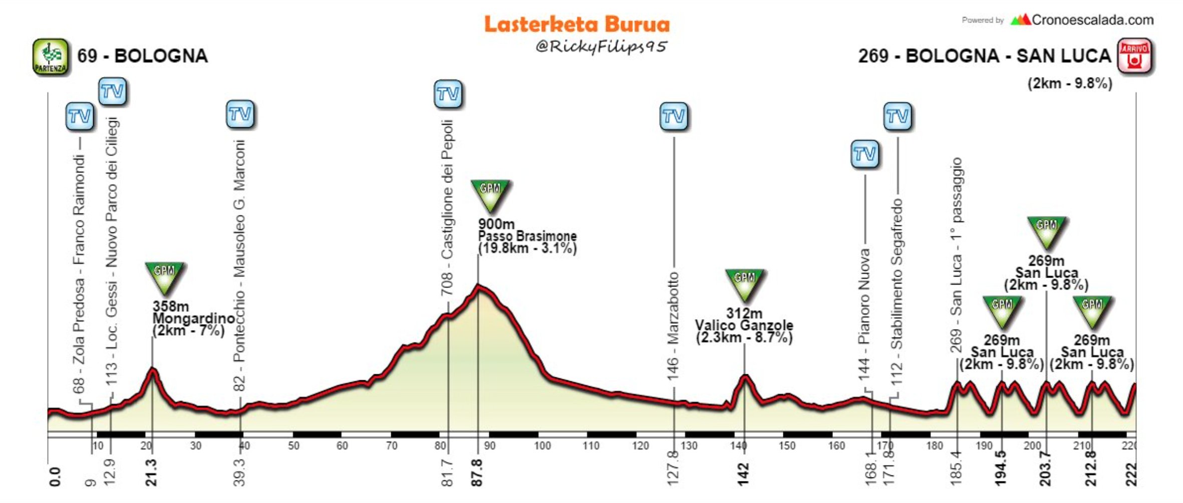 Luego de eso, habrá tregua hasta el circuito de San Luca, que el mayoritario transitará cinco veces. El mismo no es nada fácil e incluye la cota de 2.1 km al 10% (máximas del 18%).
