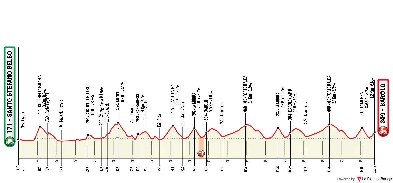 El recorrido fue modificado, siempre pensando en atraer a gente en fase de preparación para otros objetivos. Así como Milano-Torino fue para sprinters con San Remo en la cabeza, esta versión de Piemonte será para puncheurs con miras a Lombardia.