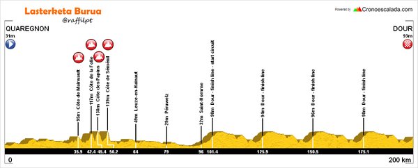Los cuatro tramos adoquinados son: Rue du Vert Pignon (una estrella y 1400 metros); Côte de la Roquette (dos estrellas y 500 metros); el Chemin de Wihèries (tres estrellas y 100 metros) y la Rue de Belle Vue (tres estrellas y 700 metros).