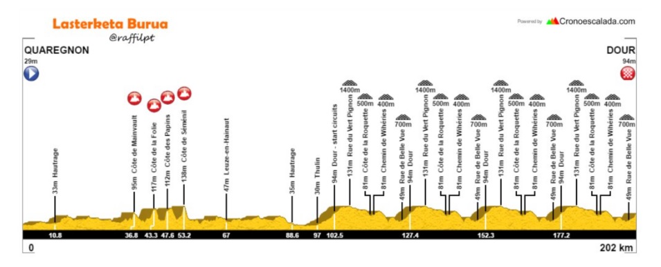 El circuito contiene cuatro sectores adoquinados de diferentes categorías de dificultad. Las más duras son Chemin de Wiheries y Rue de Belle Vue, afortunadamente para los pedalistas, de menos de un kilómetro cada una.