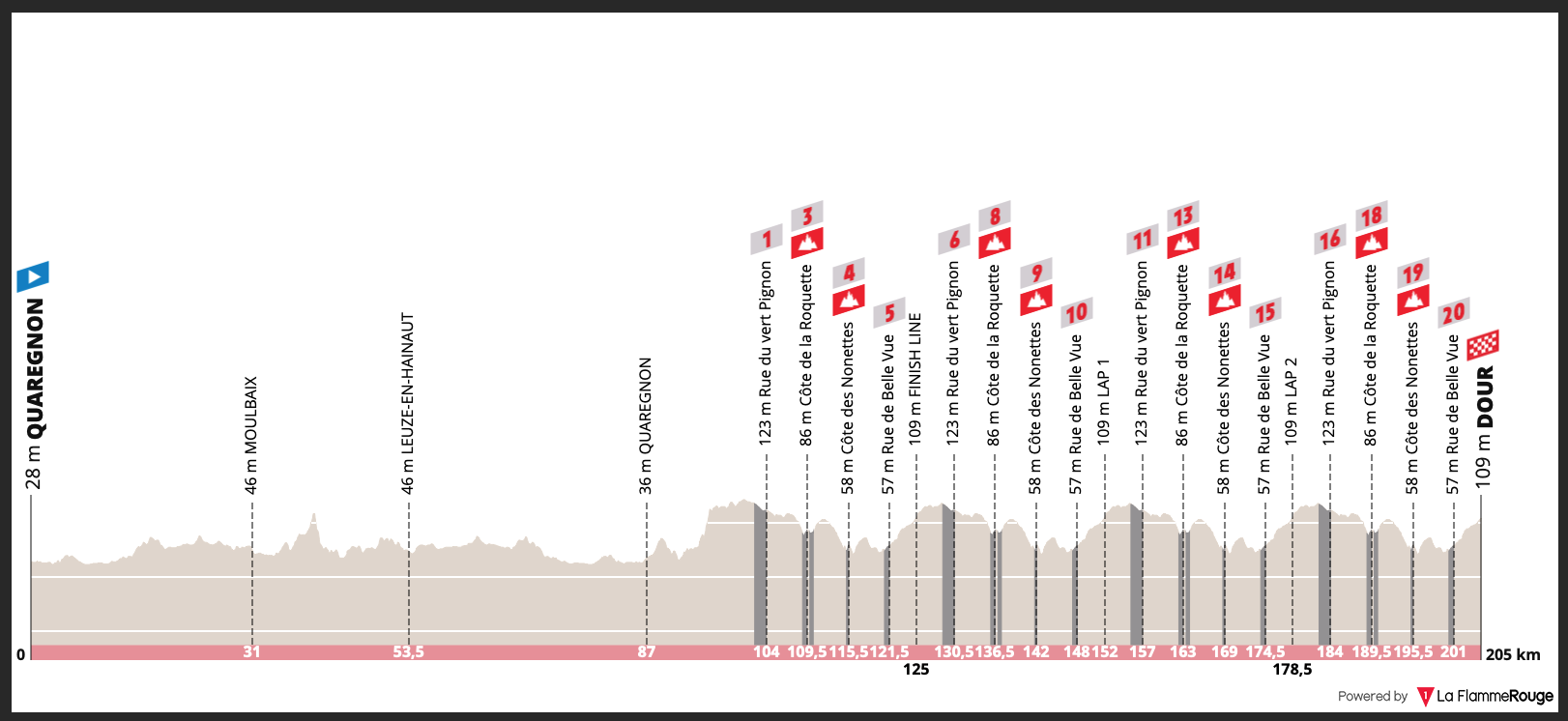 Rue de Belle Vue es el último tramo del día, también el más duro. Son 500 m y termina a 2.5 km de meta. El año pasado parecía que el movimiento ganador salía de allí, pero no hubo cohesión entre los cuatro punteros y fueron alcanzados.