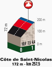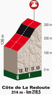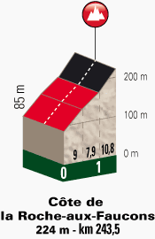 Superado este tramo, llega la parte definitoria de la competencia con la Côte de La Redoute (2km al 8,9%) en el kilómetro 218,5, punto habitual de selección y de ataques lejanos; poco después, hace su aparición Côte des Forges (1.9 km al 5.9%), antesala del plato principal:Côte de La Roche-aux-Faucons (1,5km al 9,3%) y Côte de Saint-Nicolas (1200 mts al 8,6%), esta última ubicada a 5 kilómetros de la meta.