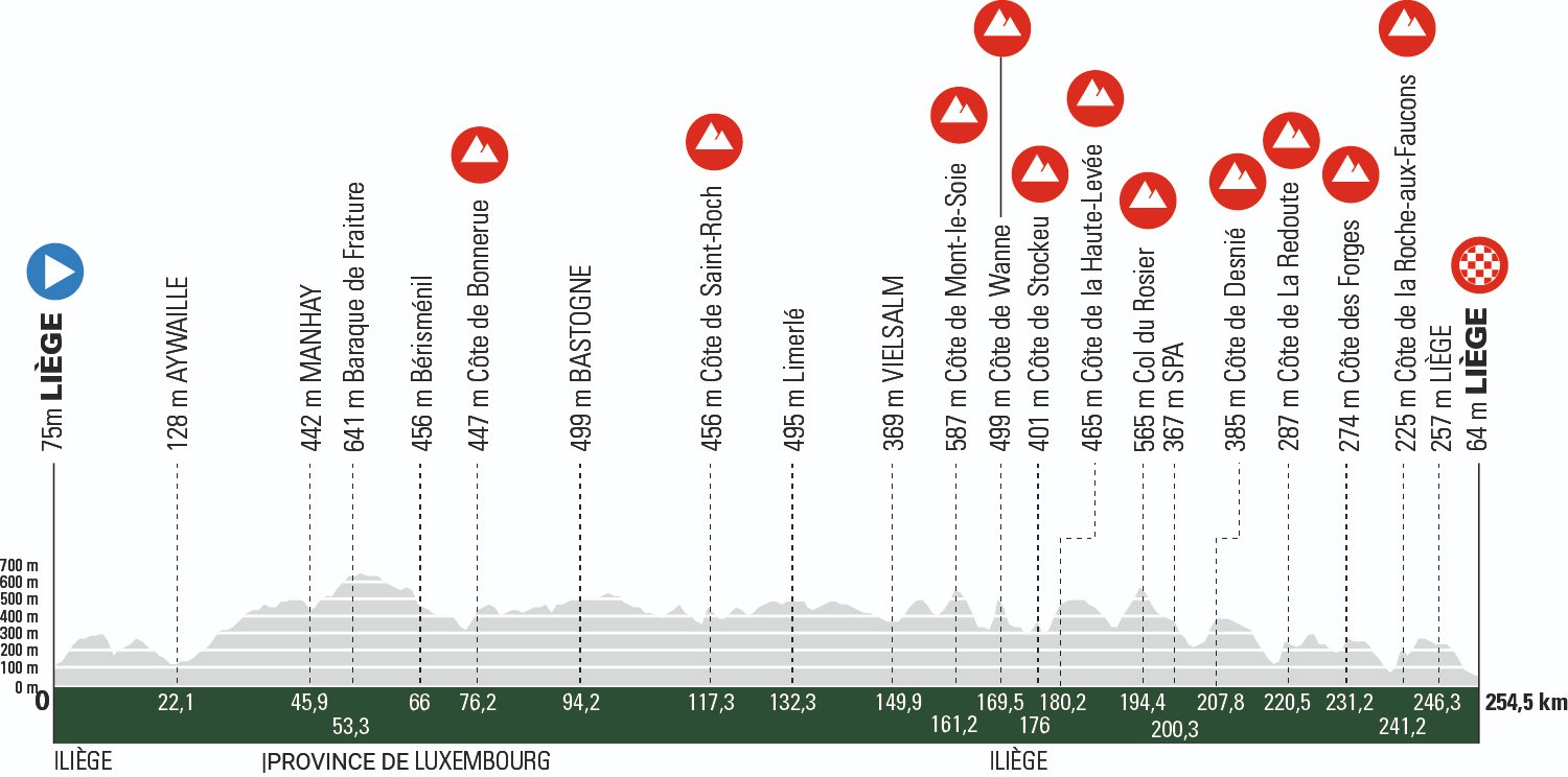 Los primeros 94 kilómetros se harán de ida desde Lieja hasta Bastoña pasando por una ruta con varios repechos y colinas aunque ninguno muy transcendental. A partir de allí el pelotón dará vuelta y regresará a Lieja por otra ruta que es en la que encontraremos los obstáculos más duros y decisivos.