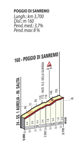 Como todos saben, los ataques suelen comenzar en las dos cotas finales, la Cipressa y el Poggio. Ninguna de las dos son particularmente duras, pero luego de 270 kilómetros, hasta la más mínima tachuela es exigente.