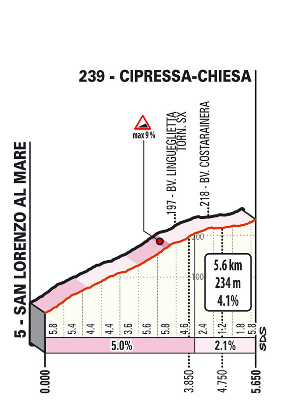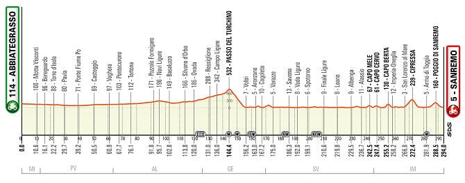 El nuevo trazado no tarda mucho en tomar las carreteras originales y tras bordear el rio Ticino hacía a Pavía, retoma su trazado clásico hacia Génova con la subida al Passo del Turchino, donde los ciclistas podrán ir tomando contacto con lo que les espera. Hasta el Mar de Liguria, donde en dirección oeste bordean la costa durante casi 100 km, hasta el encadenado de los Capi (Il Mele, Il Cervo y Berta), la parte final encadena la Cipressa y el Poggio de Sanremo, dos puntos determinantes para el devenir de esta impredecible carrera.