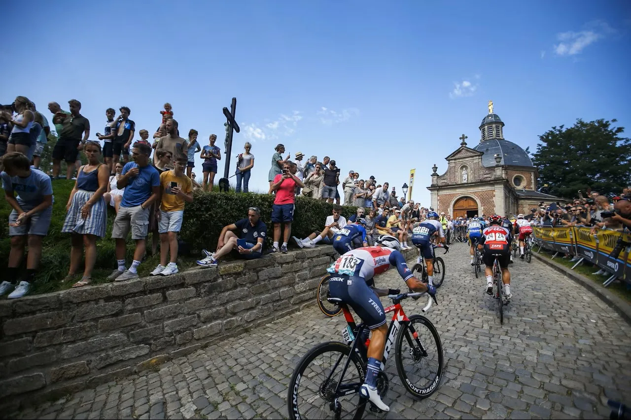 62 km a meta: Si bien antes de este punto ya ha habido un par de cotas y un par de tramos de adoquín, aquí comienza lo intenso: el muro de Eikenberg, de 1,2 km de longitud e inmediatamente después la subida de Wolvenberg. A partir de aquí el pelotón va comenzado a reducirse drásticamente.