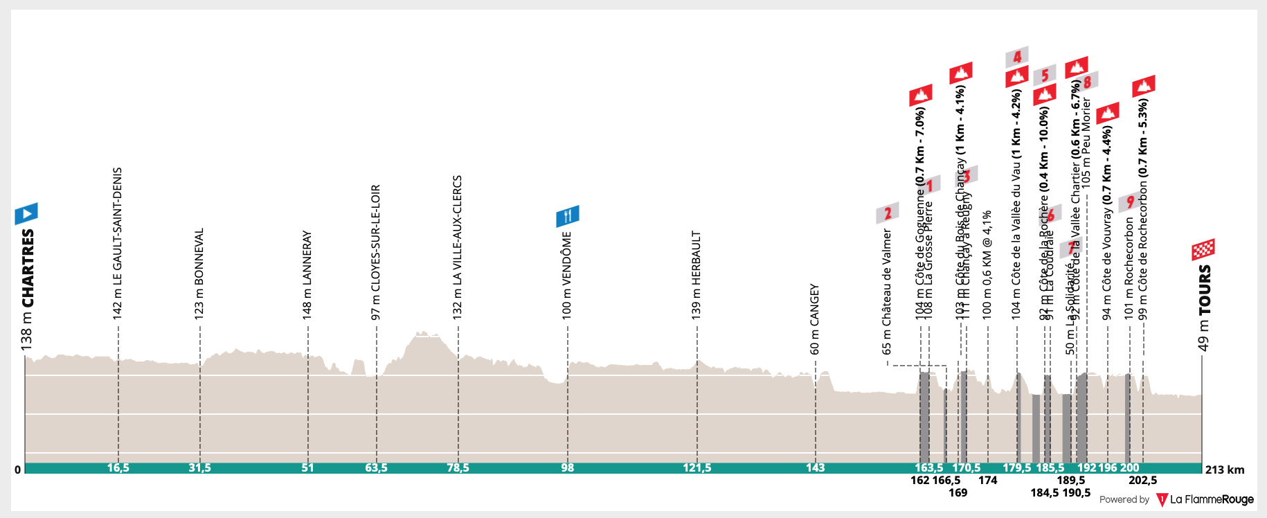 Es normal que el viento destroce esta carrera, sobre todo en Chartres que está muy expuesto. En esta ocasión las ráfagas golpearán a favor hasta que estén cerca de Tours. Sólo hay una parte, en el km 25 y durante 20 km, en el que los pedalistas encontrarán viento cruzado. Seguro alguien rompa el grupo, pero quedará mucho a meta.