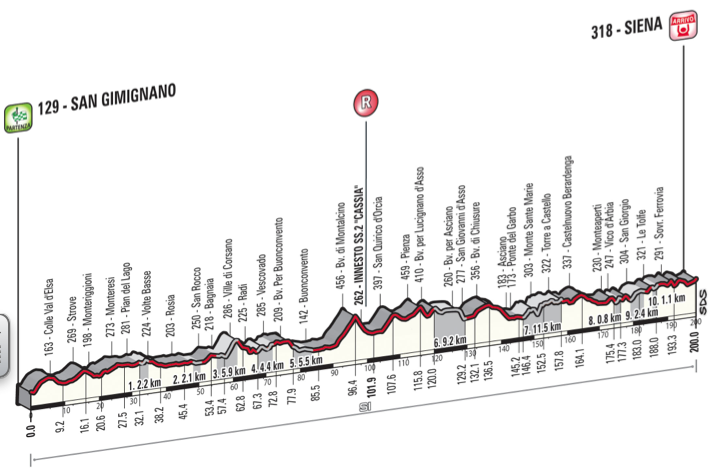 El perfil es ondulado gracias a la presencia de numerosas cotas empinadas y cortas y descensos veloces. Sumen el sterratto y entenderán por qué fue elevada a nivel World Tour. El clima se anticipa agradable y soleado y eso implica que volará polvo por todas partes.