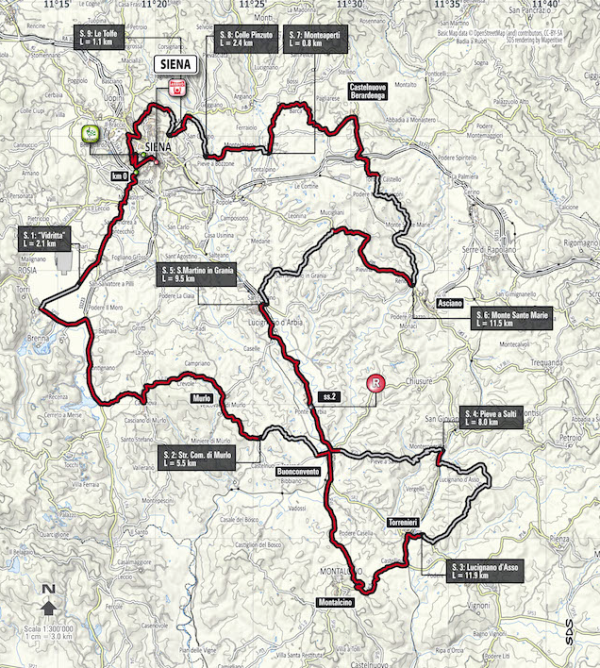El sector 7 consta de apenas 800 metros, pero los dos últimos tramos son muy duros, con subidas empinadas. Debido a la exigencia de las “rutas blancas”, el grupo de punta será reducido en las inmediaciones de Siena. La cantidad de unidades dependerá de las circunstancias de carrera y la forma de los elegidos, pero no deberían ser más que un puñado.