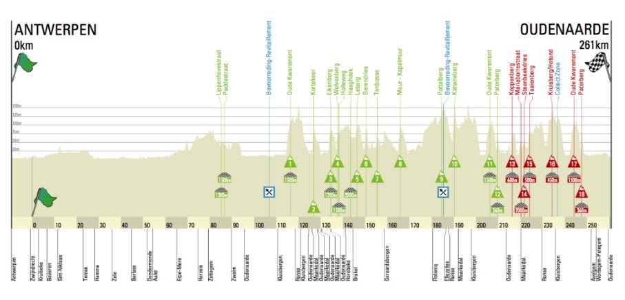 En un evento tan exigente nunca se sabe dónde se producirá el movimiento ganador, pero sí dónde puede perderse la carrera. Un gran número de corredores quedará cortado en el Taaienberg, Kwaremont y Paterberg, cotas más duras de lo usual debido a las barreras dispuestas en las cunetas que forzarán a los protagonistas a rodar por el medio de las rutas adoquinadas.