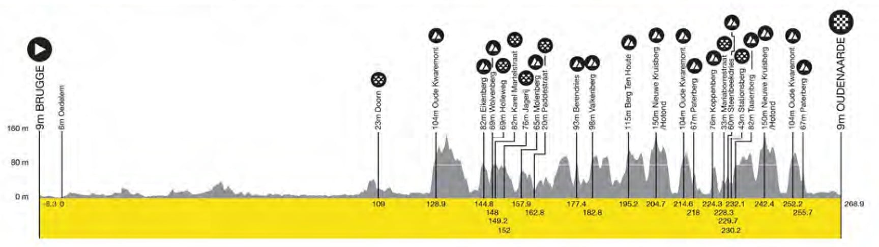 Habrá 16 ascensiones a 12 diferentes muros, ya que algunos como el Oude Kwaremont o el Paterberg (dos de los más decisivos de la carrera) se subirán más de una vez.