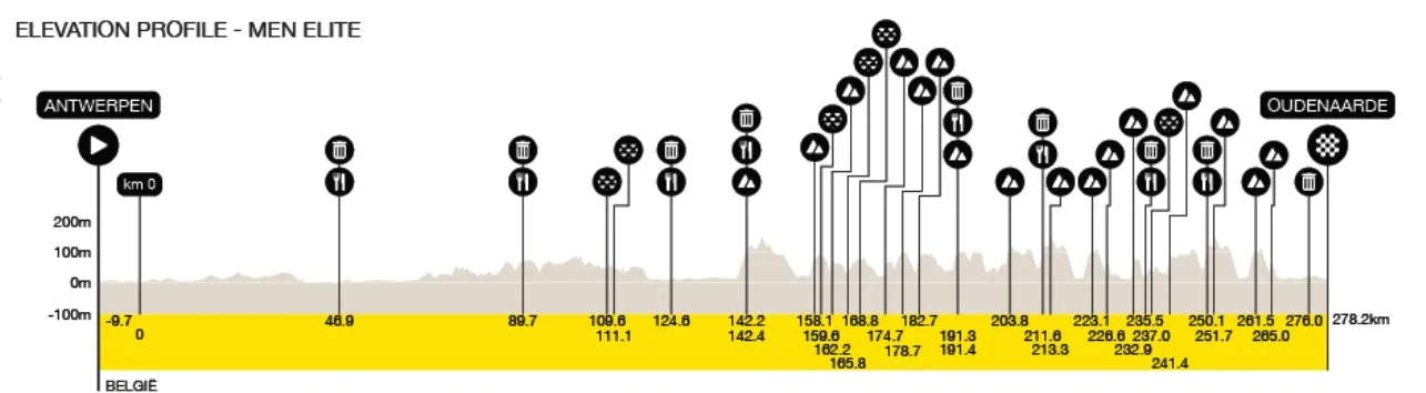 La edición número 110 de la Ronde van Vlaanderen se disputará sobre un trazado de 278 km con partida en el puerto de Amberes (Antwerpen) y llegada en Oudenaarde. El infernal recorrido incluirá 12 muros (algunos de los cuales se suben más de una vez como el Oude Kwaremont que se superará en 3 ocasiones) y 16 tramos de adoquín. A continuación veamos a detalle cuales pueden ser los puntos clave de la ruta, tomando en cuenta que un Monumento como este resulta siempre impredecible, aún más con la participación y el clima que tendremos este año.