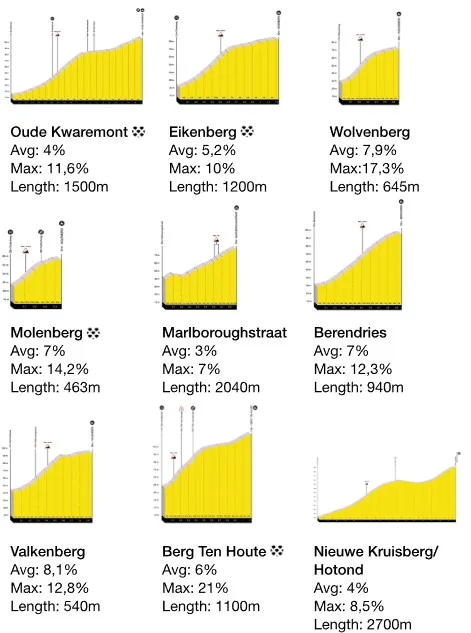 118 km a meta – encadenados: Ya hemos dicho que en una carrera como esta pueden pasar cosas importantes en cualquier momento. Pero hemos elegido destacar este tramo por ser uno de los que acumulan más desafíos en un corto trecho de carretera, y donde el pelotón se irá haciendo más pequeño rápidamente: los muros de Eikenberg y Wolvenberg se presentan uno casi inmediatamente después del otro, y entre ellos el tramo adoquinado de Holleweg todo eso en menos de 8 km y justo cuando los corredores ya llevan más de 150 km en las piernas.