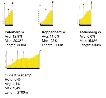 46 km a meta – Koppenberg: De todos los muros de Flandes, de todos los muros incluidos en esta carrera, pocos son más terribles que el Koppenberg. No es el más largo, de hecho al contrario es relativamente corto, pero su combinación de rampas de hasta 22%, adoquin particularmente difícil y esto cuando la carrera ya comienza a lanzarse. Es común que los corredores tengan que poner pie a tierra y terminar de subirlo caminando, y si este año las piedras están mojadas por la lluvia puede ser un espectáculo dantesco, y la carrera puede saltar en mil pedazos.