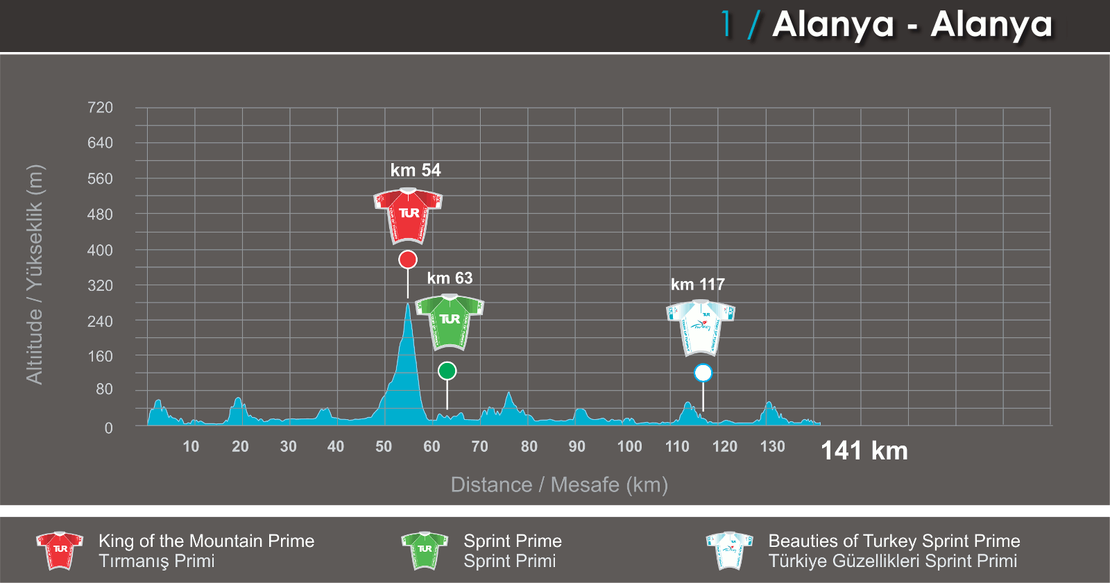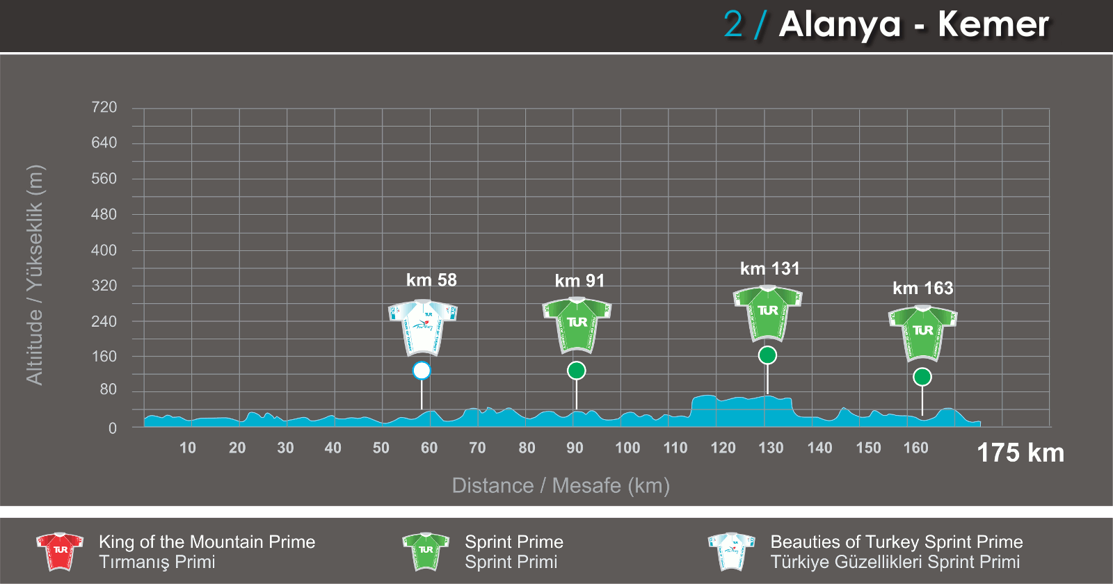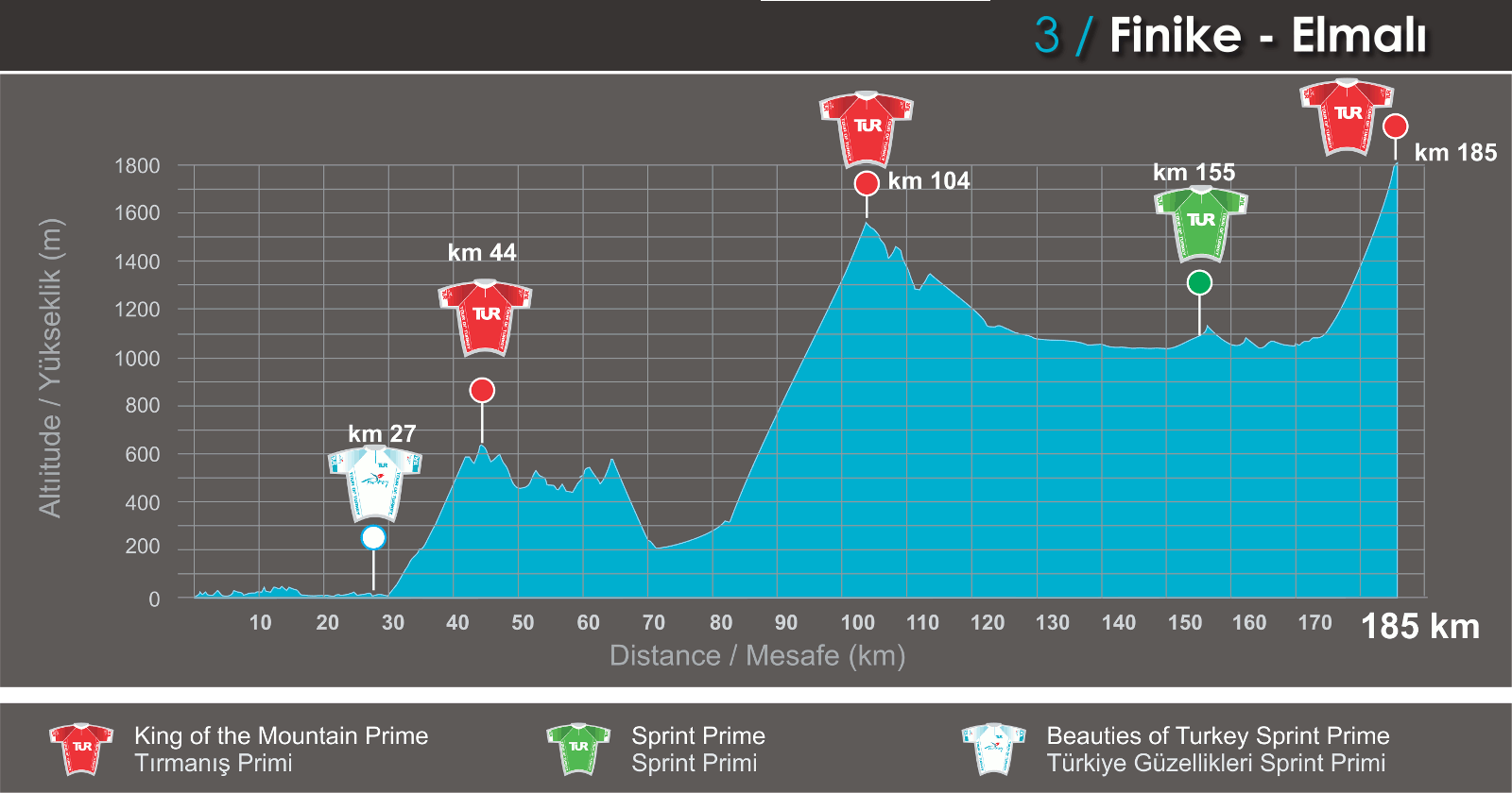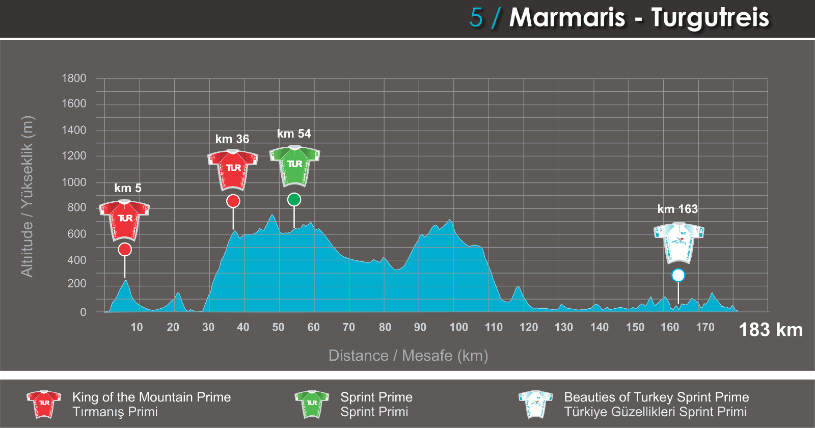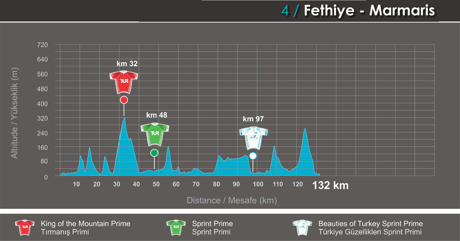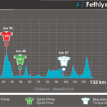 La etapa 4 podría ser para una escapada debido al perfil quebrado que aunque sólo presenta una cota categorizada de 3º en el inicio, luego tiene varios repechos (uno de importancia antes de entrar a Marmaris) en el tramo final del parcial, que también podría ser testigo de un sprint.