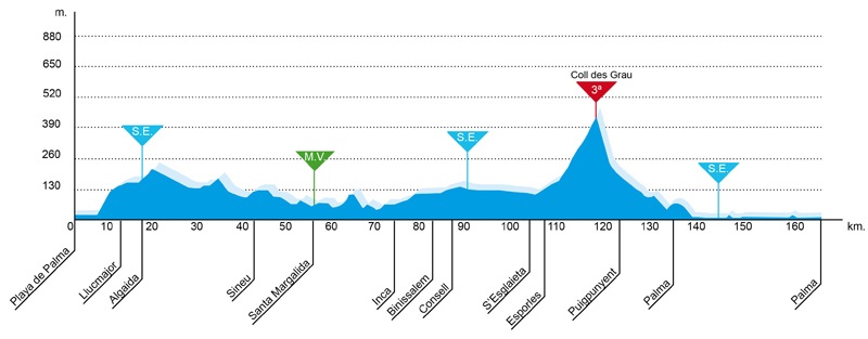 El recorrido no cuenta con muchos misterios. El pelotón partirá desde la Playa de Palma a las 10 de la mañana (hora local), teniendo como única complicación del día el Coll des Grau, un puerto de 3º categoría, corto pero empinado, con rampas de hasta el 12,7%.