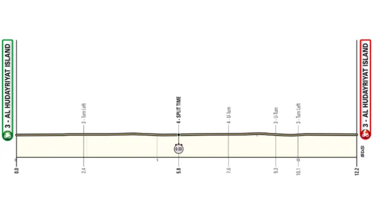 La segunda etapa se disputa íntegramente en la isla Al Hudayriyat y es una contrarreloj individual de 12 km. Es una réplica exacta de la segunda etapa del año pasado, en la que Joshua Tarling venció a Stefan Bissegger y al dúo de UAE formado por Pogacar y Jay Vine. El recorrido tiene algunas curvas en ángulo recto y dos giros en U. El viento también podría ser un factor.