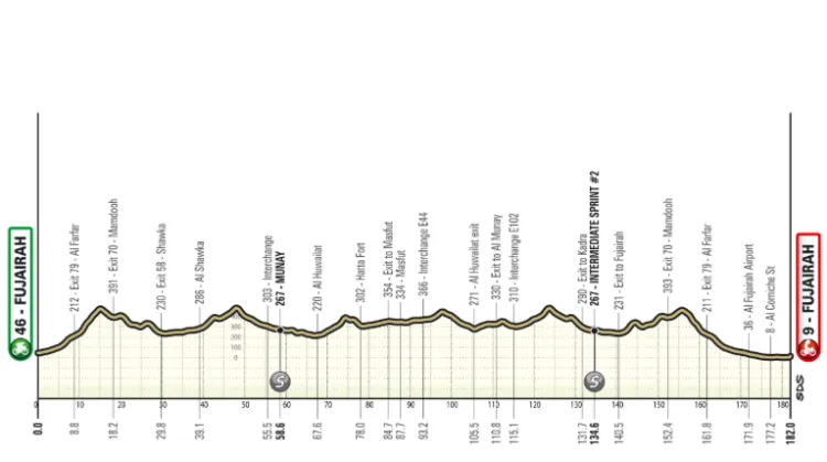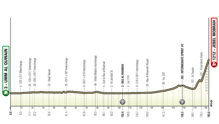 Etapa unipuerto para la general con el nuevo final brutal de Jebel Mobrah. La subida se divide en dos, con una pendiente media del 7% en los primeros 6,5 km, antes de pasar los siguientes 2 km en descenso. A partir de ahí, comienza la prueba principal, donde los ciclistas se enfrentan inmediatamente a una pendiente del 17%, que luego se reduce a una media del 12% en los últimos 5 km. Decididamente un desafío mucho más complejo que Jebel Jais (de 19 km al 5,6%) que era una ascención larga y constante, pero donde no se marcaban grandes diferencias (30 corredores llegaron el año pasado dentro del minuto). Se trata de una pendiente que recuerda al Angliru.
