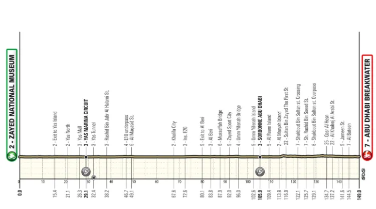 La primera etapa arranca con un recorrido hacia el sur para dar dos vueltas a un circuito de 18 km antes de que el pelotón dé la vuelta para terminar en Liwa. La primera mitad es mayormente en recta con riesgos de abanicos que pueden traer caos. Es una primera oportunidad para los sprinters, aunque el último kilómetro presenta una ligera subida, de alrededor de 1,4 km al 4% en recta, lo que no favorecerá a Jonathan Milan y a otros velocistas puros. ¿Se animará Del Toro a atacar y sacar algún segundo de ventaja?