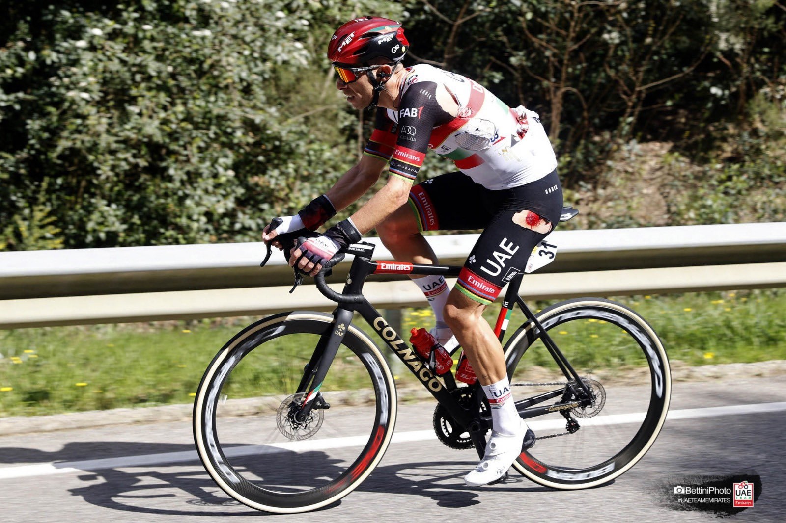 Después de la competencia, el portugués del UAE Team Emirates comentó la situación. “Un compañero del Deceuninck-Quick Step, Pieter Serry, y yo fuimos atropellados por una moto de carrera”, dijo el luso en su cuenta de Facebook. “Intenté seguir pero los dolores en la pierna izquierda eran fuertes y me obligaron a abandonar”, añadió.