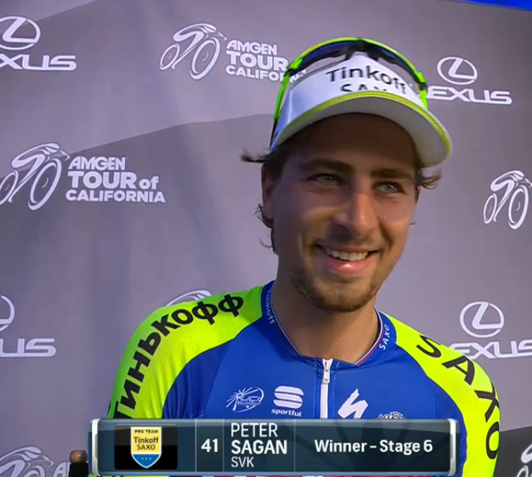 Peter Sagan (Tinkoff) ganó la 6° etapa del Tour de California, una contrarreloj individual de 10.6 kilómetros en Big Bear Lake en la que voló para relegar al segundo, Van Emden, por un amplio margen. Sagan es nuevo líder de la competencia.