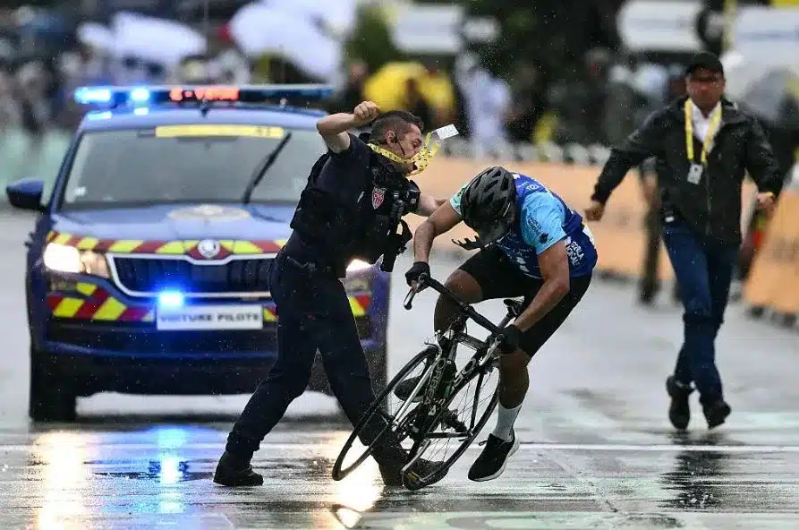 Un agente de policía tacleo hoy a un hombre que se metió con su bicicleta en la meta de la etapa 17 del Tour de France en Valence, momentos antes de que llegara el pelotón. El individuo, que vestía una malla de Decathlon AG2R La Mondiale de Decathlon saltó las barreras aproximadamente un minuto antes de la llegada prevista de los ciclistas y comenzó a rodar por delante del auto de los comisarios. Las imágenes de seguridad lo mostraron transitando por la resbaladiza zona de meta mientras un oficial del Tour de France intentaba intervenir sin éxito.