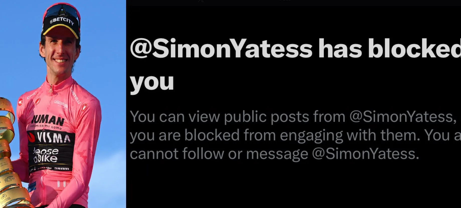 Ahora suma otro elemento que el británico tomó del manual de las cosas que no se deben hacer en un contexto como el que está sumergido.En el día de ayer, el ahora ex corredor británico de 33 años, empezó a bloquear en la red social X a una gran cantidad de cuentas vinculadas con el ciclismo: desde medios de comunicación a presentadores de podcasts, analistas e influencers. Todo esto desde una cuenta que no postea desde 2020 y que aún mantiene una vieja foto en uniforme de su ex equipo, Jayco AlUla.
