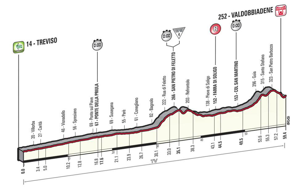 By David Hunter Treviso – Valdobbiadene 59.4km I’ll start with the weather report….rain and lots of it! This is not what the GC riders wanted to hear. This stage is hugely important to the overall standings and the wet weather is going to increase the difficulty, considerably. There are plenty of corners and we are bound…