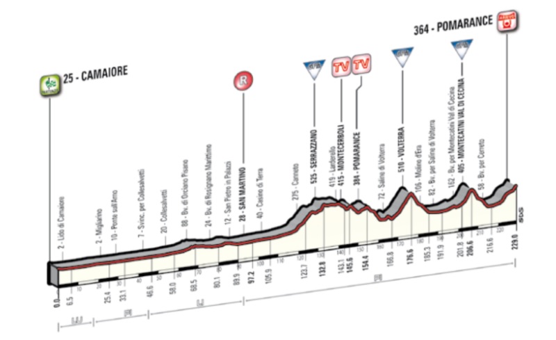 The climb to Volterra begins at 170km and is 9.85km at 4.5%. Nothing too difficult, this is just the starter! Next is the climb to Montecantini, 4.8km at 5%. This climb ends with 22km remaining. Next up is the climb to the finish in Pomarance.