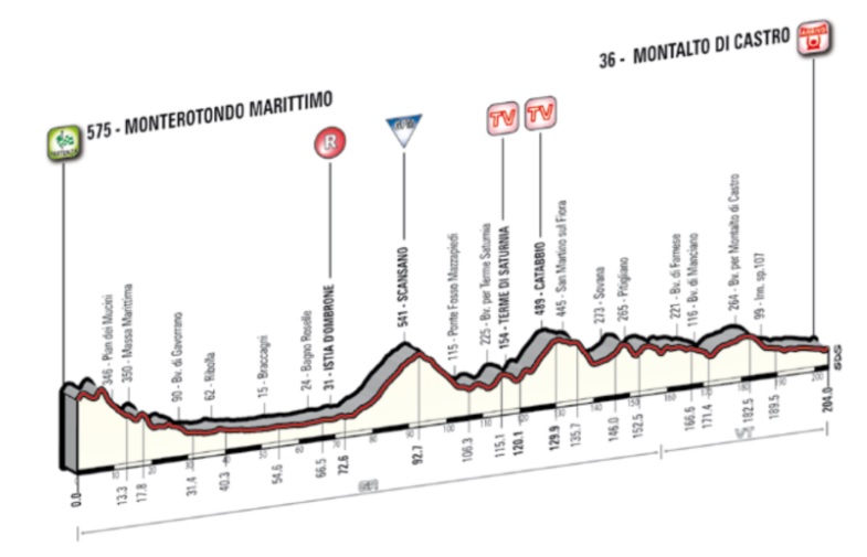 As it’s Tirreno, even the flat stages have their challenges. This stage has a few difficult moments for the sprinters, the first being a 20km climb at 2.6%! The next major climb is 9.8km at 3.4%. The second half of the stage doesn’t contain any serious climbs but can be described as grippy.
