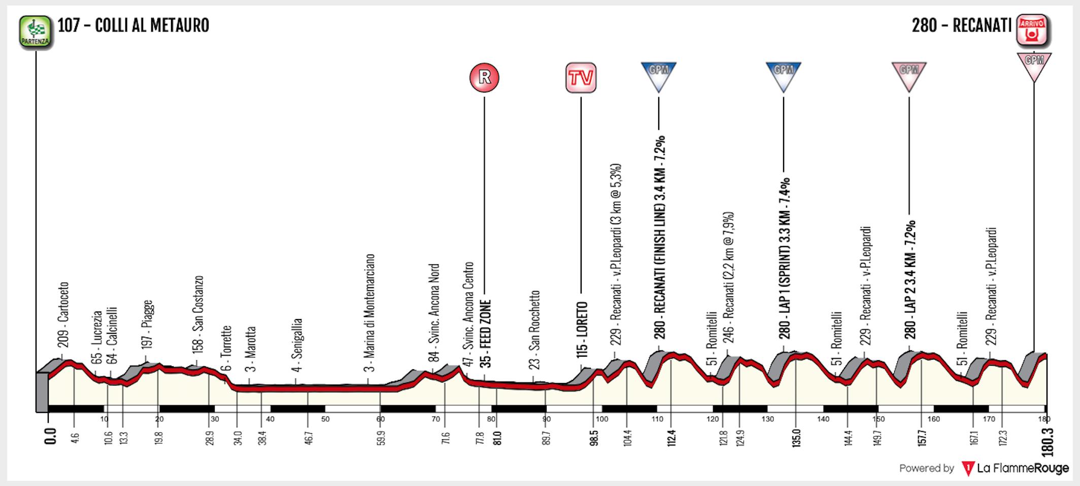 Tras un arranque relativamente plano, las cosas se pondrán tremendas cuando el pelotón ingrese a un circuito por las calles de Recanati. El mismo incluye dos cotas.
