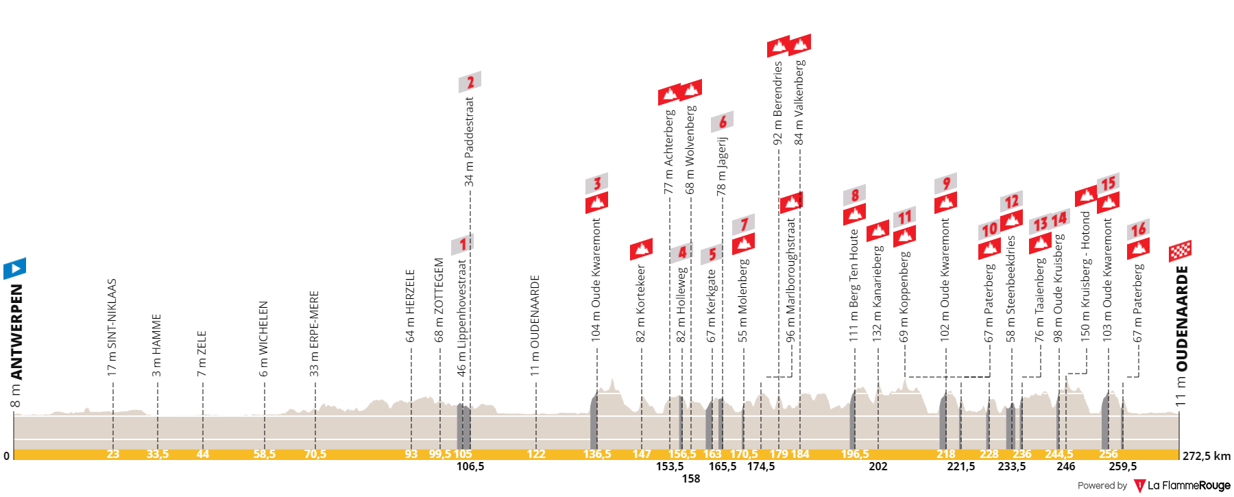 272 kilómetros en el menú de este año. La distancia hará que la carrera sea brutal, el Tour de Flandes siempre ha sido una carrera para los ciclistas que son capaces de rendir sobre una bicicleta al máximo nivel durante un gran número de horas y este año ese aforo se pondrá al límite. El inicio en Antwerpen verá un poco más de 130 kilómetros que en su mayoría serán tranquilos, aproximadamente la mitad de la carrera. Sin embargo, en la segunda mitad todo cambia, ya que el Oude Kwaremont abrirá las cosas.
