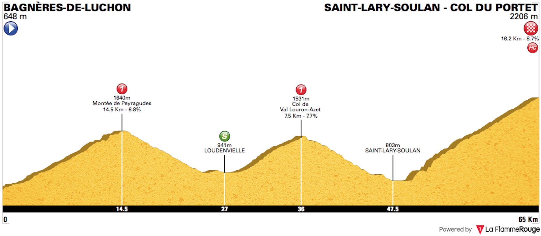 Tras su vertiginosa bajada, llega el coloso del Tour 2018, el Col du Portet. El mismo consta de 16 km al 8,7% y supera los 2000 metros de altura, algo que a muchos no les sienta bien.