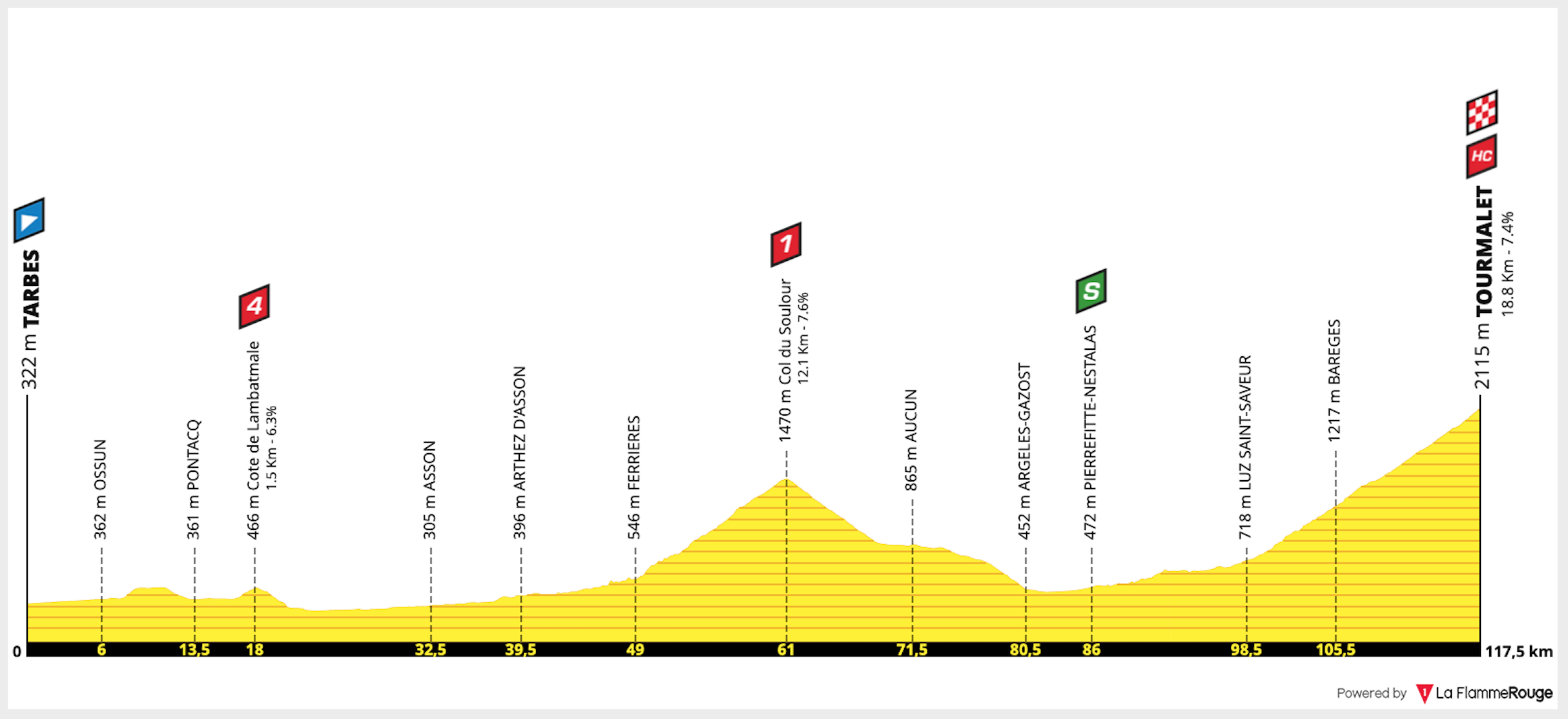 The first of the big climbing stages, such a shame it’s almost the end of the second week, but it is the Tour after all. We end with the mighty Tourmalet, taking the riders up to 2115m above sea level.