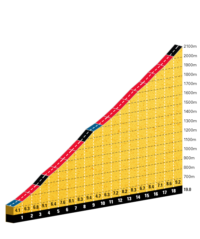 Oficialmente, son 19 km al 7.5%. Es Fuera de Categoría (HC) y techo de los Pirineos, por lo que se otorgará el Souvenir Jacques Goddet a quien lo corone. Sus rampas son bastante constantes, buenas para ascender a ritmo -¡INEOS!-, al menos hasta que la altura empiece a jugar. Recuerden que no todos los atletas rinden igual superadas determinadas cotas.