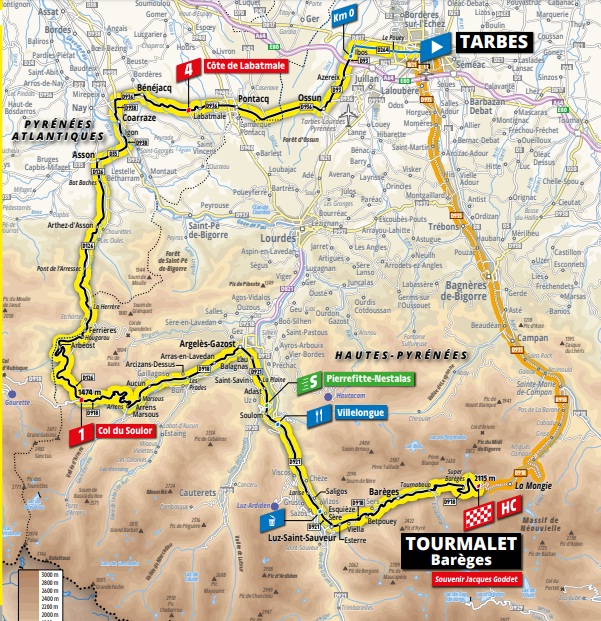 Básicamente, de allí al final de la etapa -unos 38 km- los ciclistas irán hacia arriba, buscando los 2115 msnm del Tourmalet. Los primeros 15 km son un falso llano que jugará en contra de los atacantes, razón de más para tener gregarios en vanguardia.