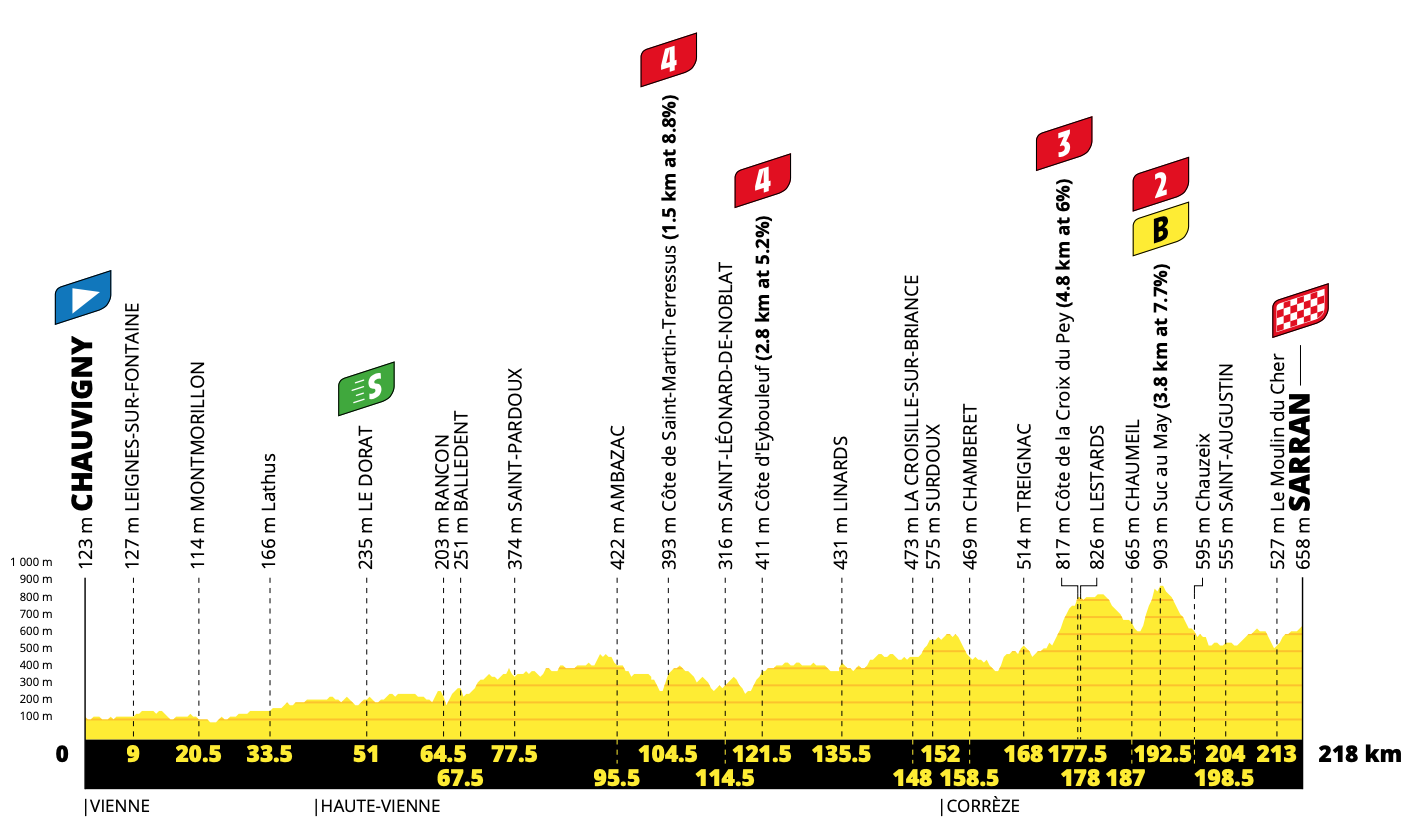 Suc au May está oficialmente mensurada en 3.8km al 7.7%, pero también pueden mencionarse sus 2.6km al 9.5%. Es un puerto empinado que se corona a 25 km de la llegada, es decir, lejos. Y eso implica que un grupo reducido llegará a destino.