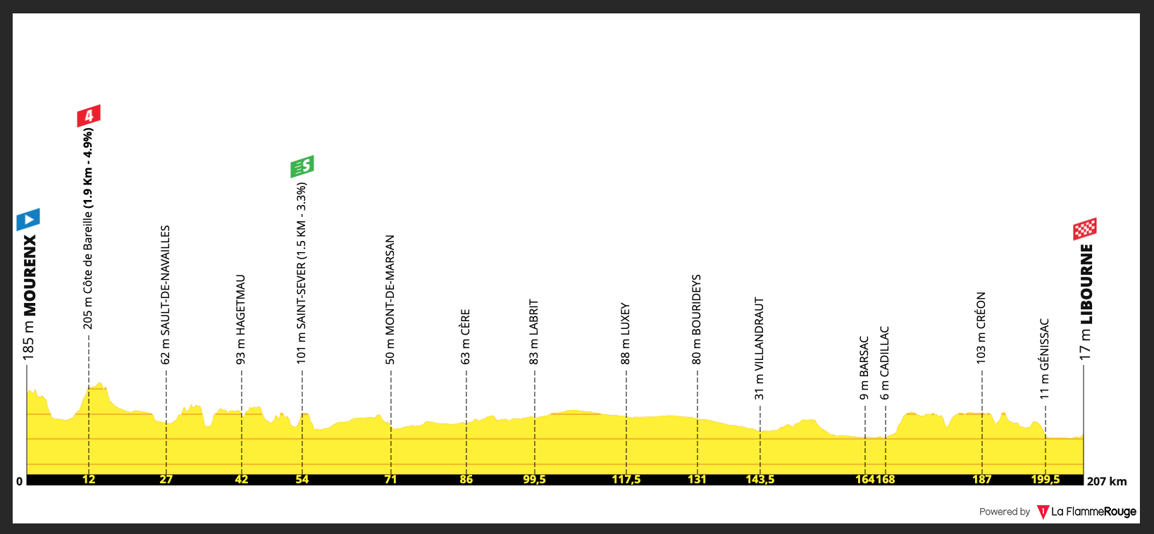 Esto son buenas noticias para los interesados en la escapada. Además, los primeros 50 km del recorrido son ondulados, factor que suele perjudicar a los que persiguen. El viento será frontal pero no muy fuerte. Puede ser una de esas etapas en las que se marcha el primer intento o, por el contrario, en el que el corte demora una hora en partir. Con sólo una formación pensando en los sprints, la escapada tiene muchas chances.
