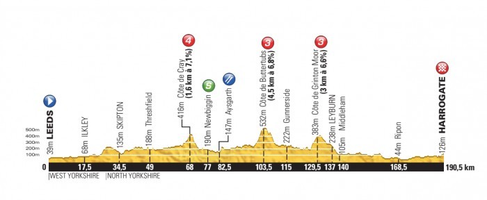 El trazado discurre por Yorkshire con 190.5 kilómetros entre Leeds y Harrogate en los que el pelotón encontrará tres cotas categorizadas, caminos muy estrechos y un final en leve pendiente que dificultará las cosas a los sprinters puros.