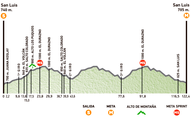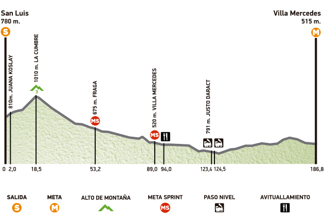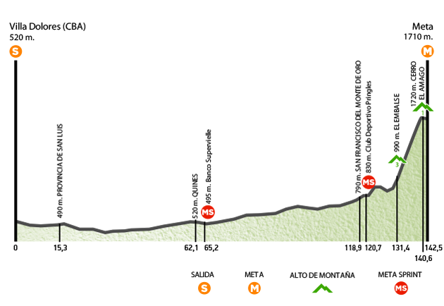 El Tour puntano transitará por Córdoba en dos ocasiones: la primera, el día que sale desde Villa Dolores y arriba al Cerro el Amago (4°), exigente subida donde Nairo Quintana maravilló hace unos meses con una exhibición en solitario.