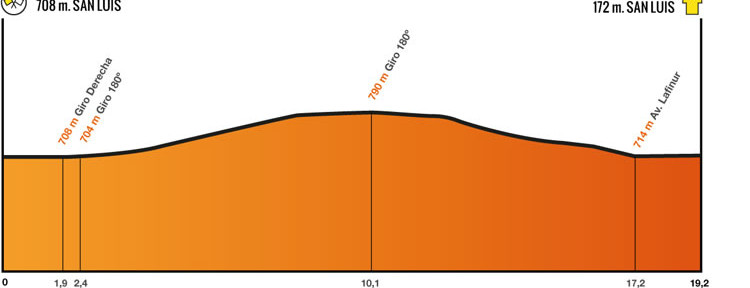 El parcial, una crono plana de 19,2 kilómetros por las calles de San Luis, no es propicio para las cualidades del tunjano, sobre todo si como se estima, se mantiene el viento que azotó la zona los últimos días.