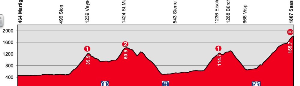The opening cat 1 climb is 10.8km at 6.8%. We then have a descent and a short, flat section before the cat 2 climb. It is 6.7km at 6.5%. Again a descent, before a short, unclassified climb and then a long stretch in the valley. We then have the 2nd cat 1 climb, 8.6km at 6.9%, before a descent to the final climb to Saas-Fee. This climb is a monster, 16.8km at 5.4%. Not the steepest of gradients but the sheer length makes this very hard. During the climb, we have some very steep sections of 9%.
