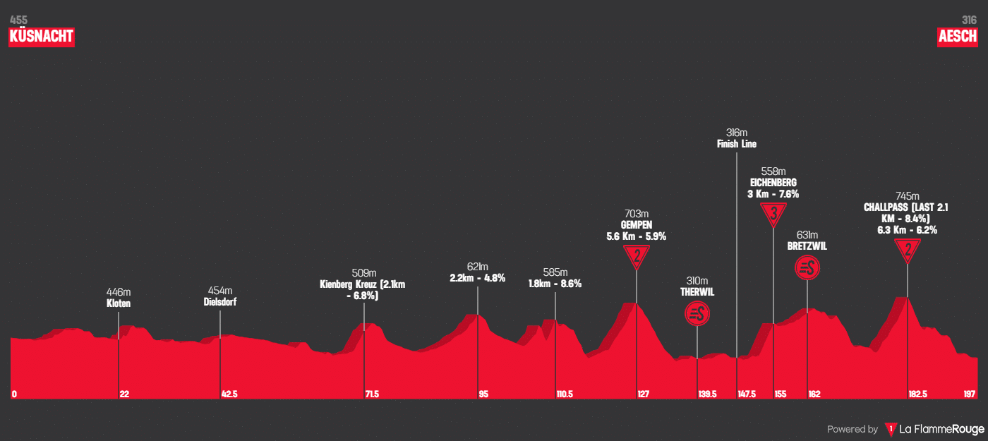 196 kilómetros en el segundo día de carrera, este con un comienzo más plano, con una primera mitad del día relativamente plana. La segunda mitad será más dura, sin embargo, con tres ascensos que marcarán las diferencias en la jornada. La subida a Gempen con 70 kilómetros (5,6Km; 5,9%) calentará las cosas.
