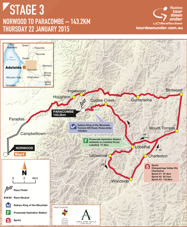 143.2km from Norwood to Paracombe and a new finish in the TDU!