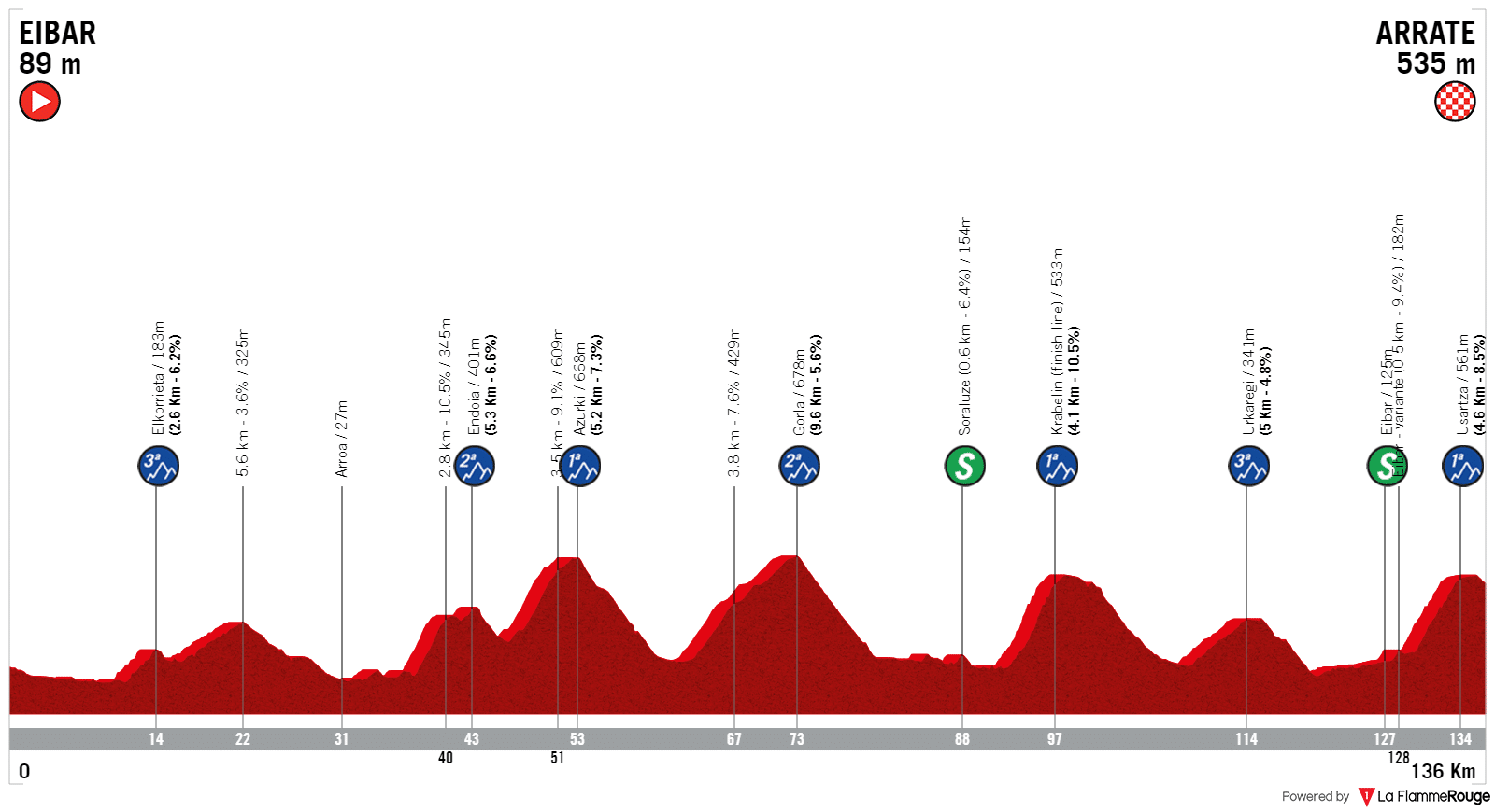 The finale of the stage and the race sees the riders go up Arrate once again. 4.6Km at 8.5%, the gradients aren’t hard but it’s nevertheless a hard climb, at the end of a very explosive day. At the summit, the race should be decided, the stage possibly not. There is a downhill finish where positioning is everything, to wrap off a hard week of racing.